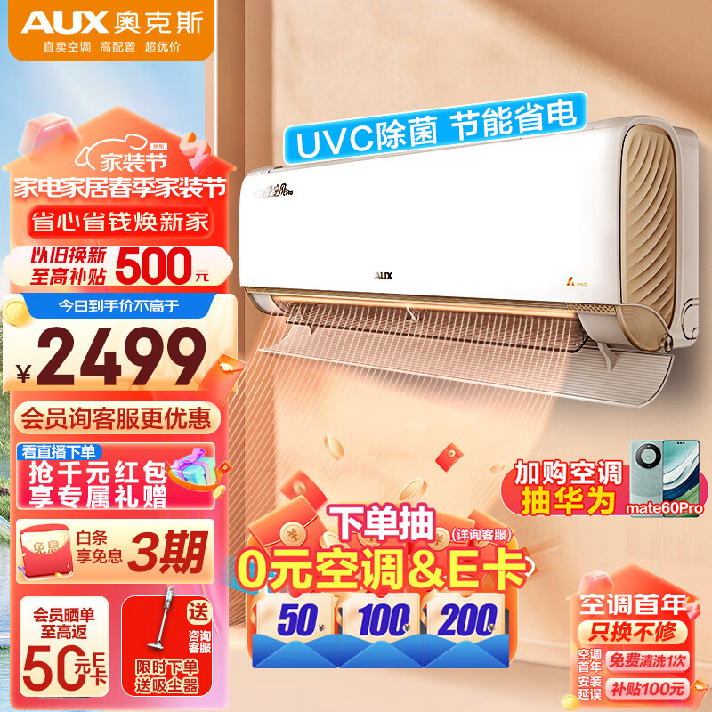 奥克斯(AUX) 1.5匹空调 新一级能效 挂机变频冷暖家用 WiFi智控 紫外线除菌KFR-35GW/BpR3DQJ1(B1)价格:2499.00元!