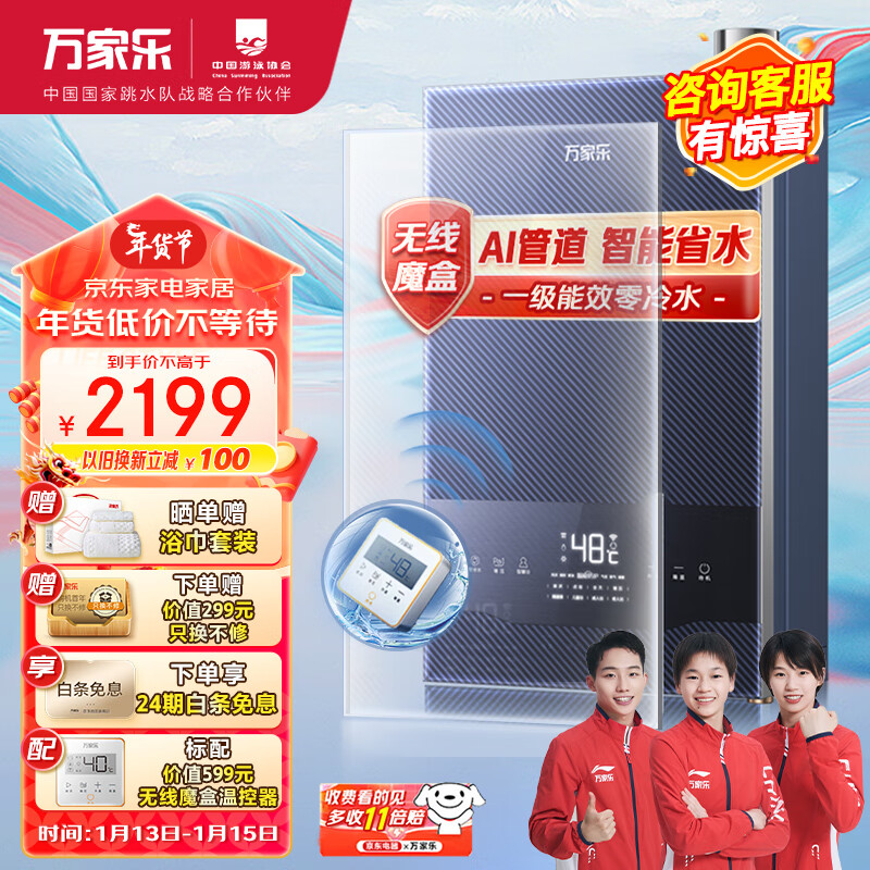 万家乐 16升冷凝式增压零冷水燃气热水器 1级能效净化水质 双屏分控wifi智控JSLQ27-16RL7价格:2199.00元!