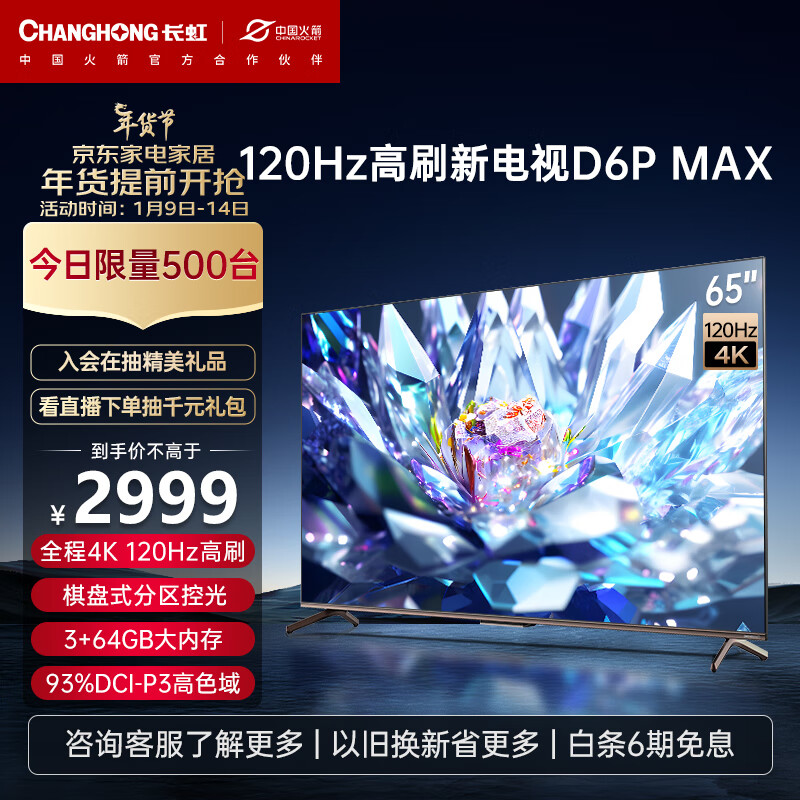 长虹电视65D6P MAX 65英寸游戏电视 4K120Hz 3+64GB大内存 分区背光 LED平板液晶电视机 以旧换新价格:2999.00元!