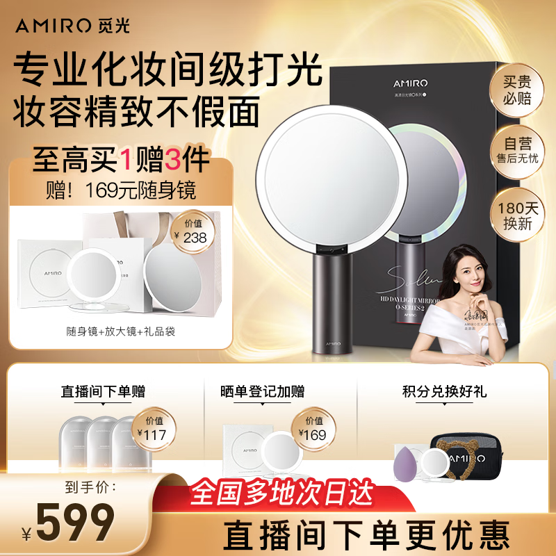 AMIRO觅光 化妆镜带灯led日光梳妆美妆镜子补光 智能高清台式便捷 生日礼物 送女生送老婆 小黑镜价格:649.00元!