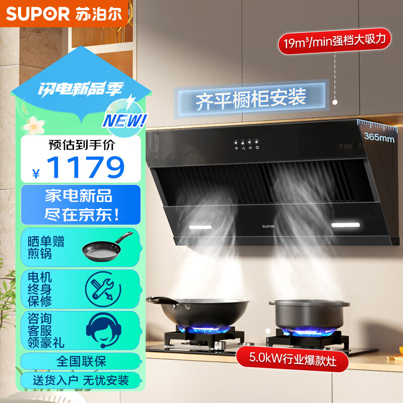苏泊尔(SUPOR)抽油烟机燃气灶套装 家用小尺寸大吸力 19立方侧吸式小户型烟灶套装 DJ13S+Q5天然气价格:1179.00元!
