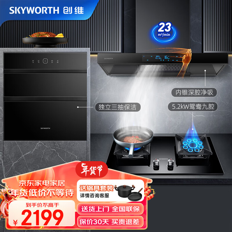 创维(Skyworth)烟灶消厨房三件套 23风量挥手智控油烟机5.2kW燃气灶 三层嵌入式二星保洁柜Y1H+Z61BS+X20A天然气价格:2299.00元!