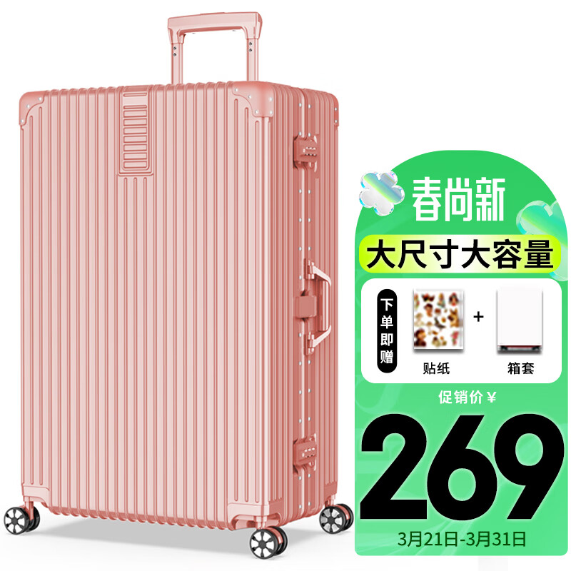 SOO行李箱男铝框商务拉杆箱大容量旅行箱密码箱女皮箱子28英寸玫瑰金价格:289.00元!
