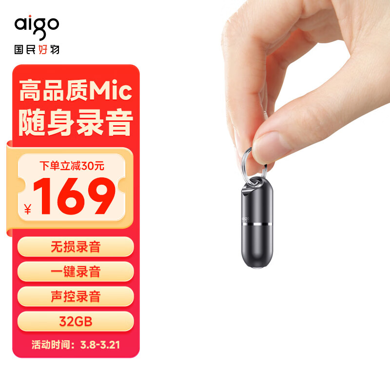爱国者aigo录音笔R9933 32G 一键录音智能商务录音器专业录音 高清降噪录音笔 学习会议采访 黑色价格:189.00元!