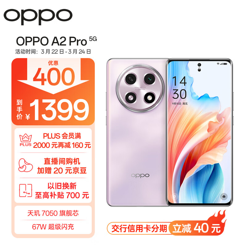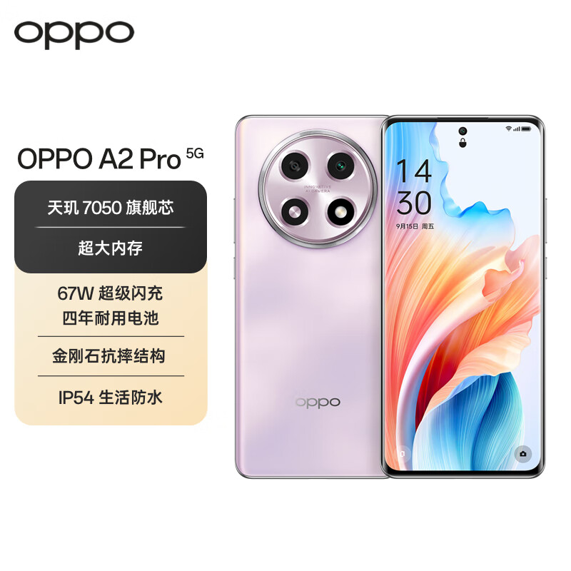 OPPO A2 Pro 天玑7050旗舰芯 67W超级闪充 超大内存 超大电量长续航 抗摔5G手机 8GB+256GB暮云紫价格:1799.00元!
