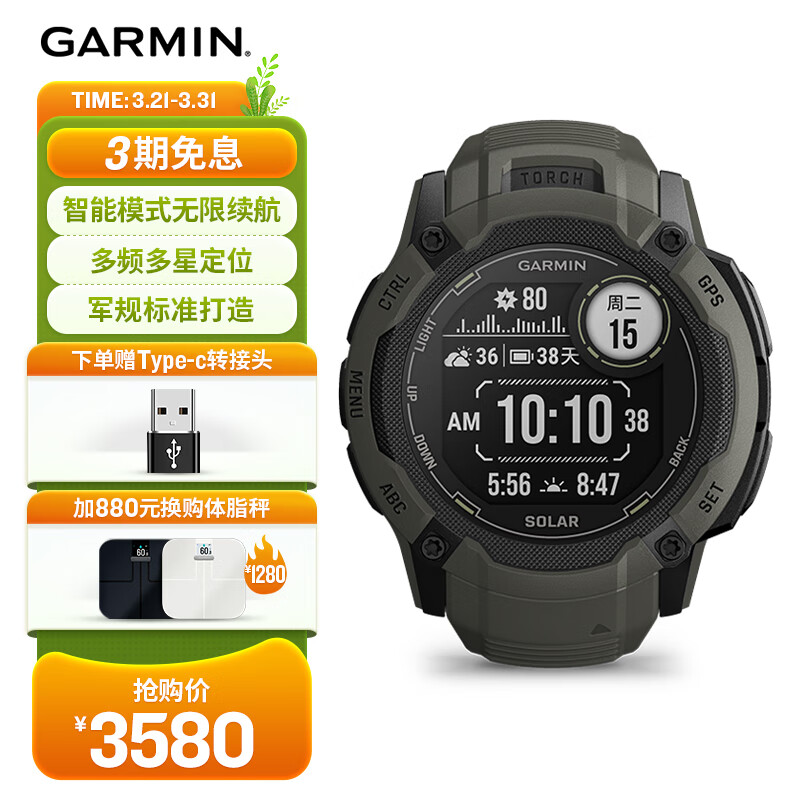 佳明(GARMIN)Instinct 本能2x多星定位皮划艇冲浪钓鱼户外智能太阳能运动手表价格:3580.00元!