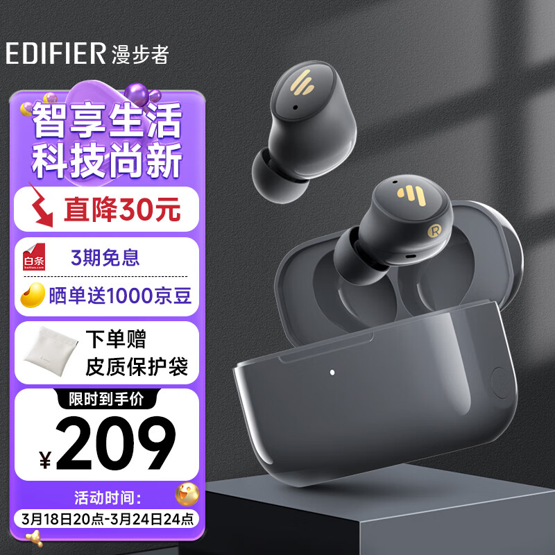 漫步者(EDIFIER)TWS1 Air 真无线主动降噪蓝牙耳机 入耳式自适应降噪 适用苹果小米华为 典雅灰价格:209.00元!