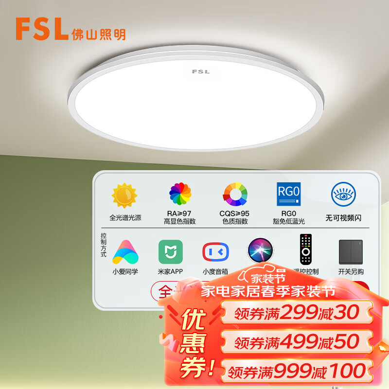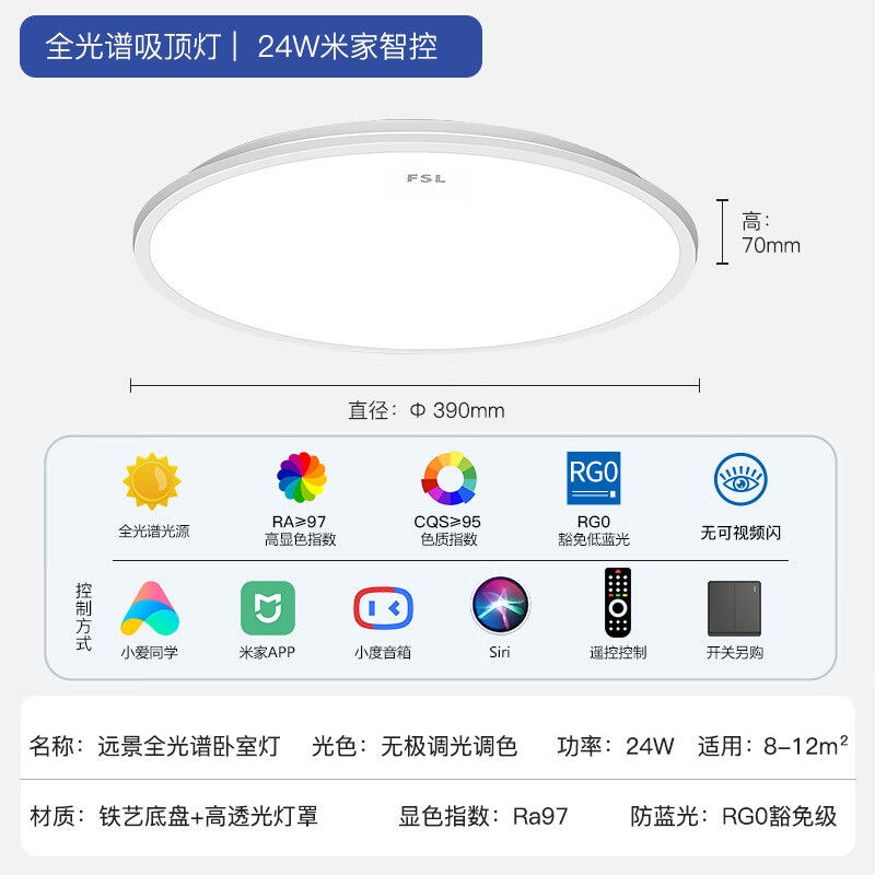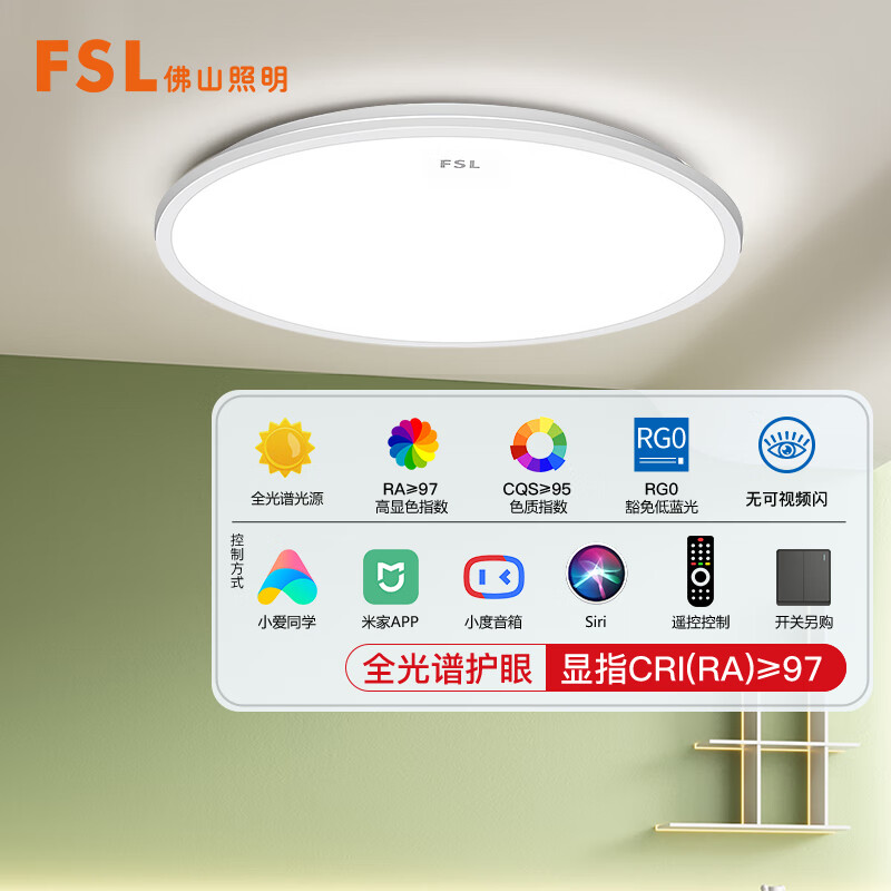 FSL佛山照明吸顶灯LED卧室灯无蓝光护眼高显97米家灯具灯饰远景24W价格:249.00元!