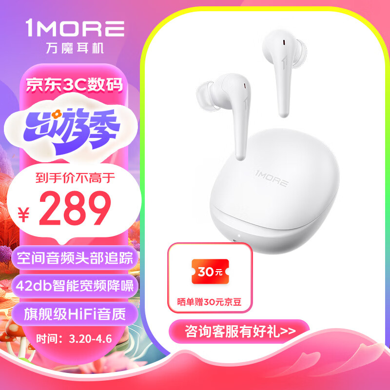 万魔(1MORE)Aero 真无线蓝牙耳机 智能深度降噪入耳式 游戏运动音乐耳机 空间音频 ES903 云母白 周杰伦代言价格:289.00元!