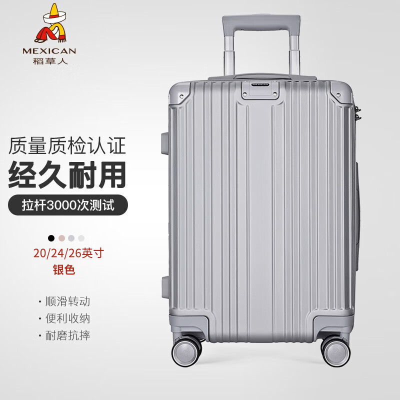 稻草人行李箱男女26英寸万向轮拉杆箱高颜值潮流学生密码箱大容量旅行箱出差皮箱子托运箱银色价格:259.00元!