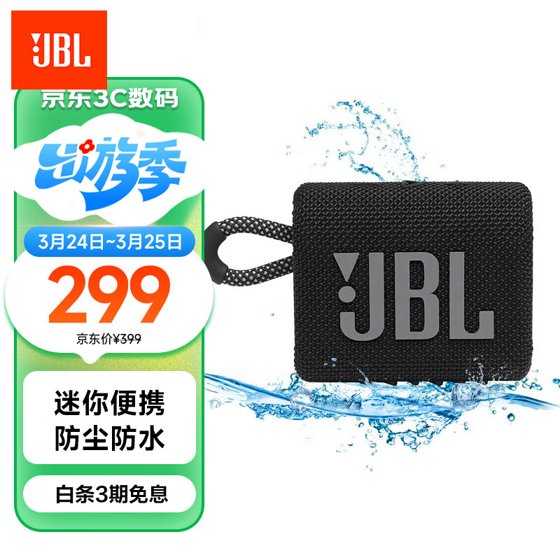 JBL GO3 音乐金砖三代 便携蓝牙音箱 低音炮 户外音箱 迷你小音响 防水防尘长续航 礼物音响 黑色价格:299.00元!