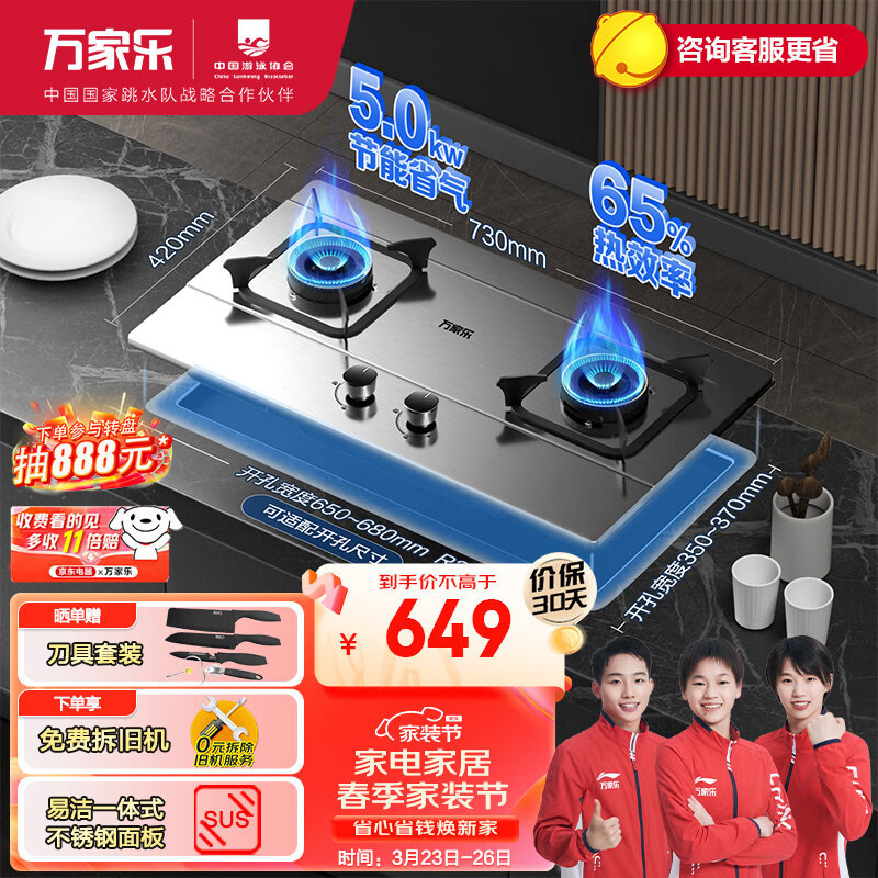 万家乐燃气灶 5.0kW大火力天然气灶猛火灶 不锈钢燃气灶 台嵌两用双灶 家用燃气灶具JZT-KV061天然气价格:634.00元!
