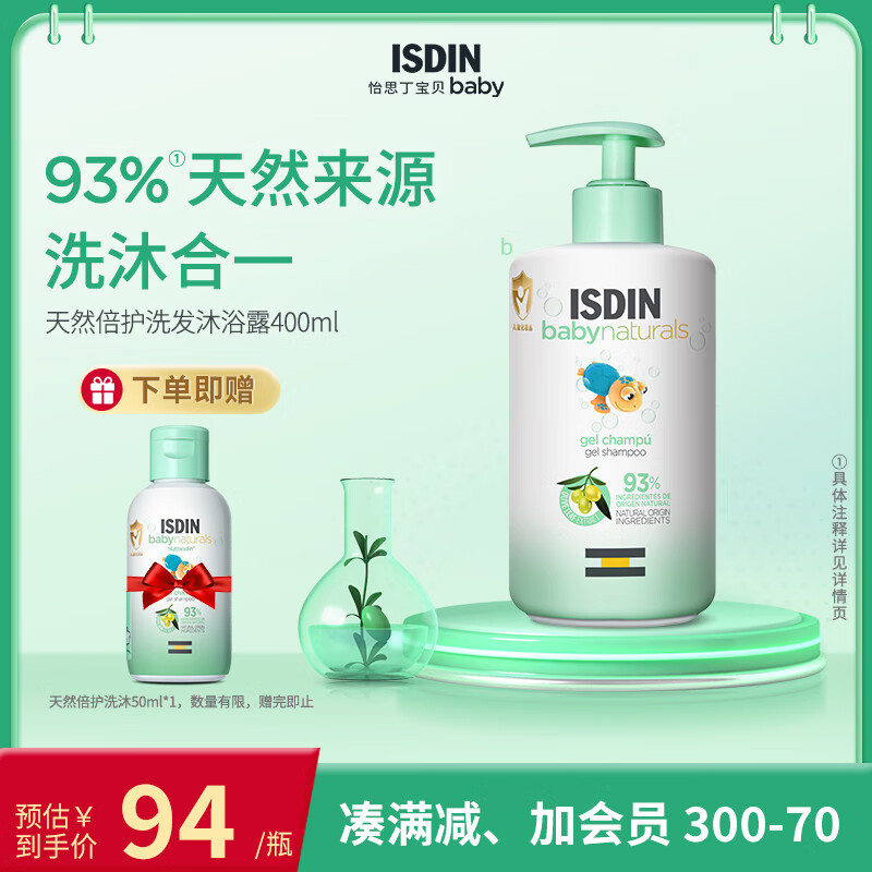 怡思丁(ISDIN)儿童洗发水沐浴二合一400ml 婴儿宝宝洗护天然温和不刺激无泪保湿价格:94.00元!