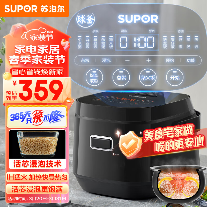 苏泊尔(SUPOR)电饭煲 电饭锅 2L智能IH电磁加热 活芯浸泡技术 五谷杂粮糙米智能防溢技术 触控面板 SF20HC949C价格:359.00元!