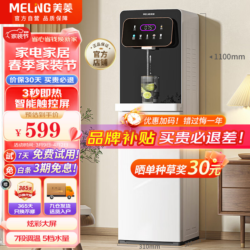 美菱(MeiLing)即热式饮水机下置水桶家用立式3秒速热即热即饮免安装全自动智能一体机高端白色饮水器MY-SX527价格:599.00元!