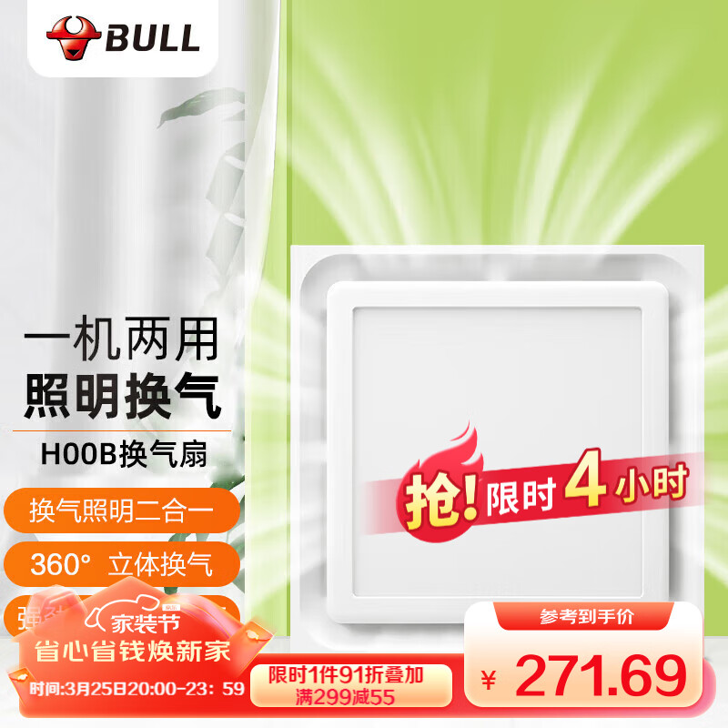 公牛(BULL)排气扇集成吊顶换气扇GH00BJZ换气照明二合一大功率排风价格:359.00元!