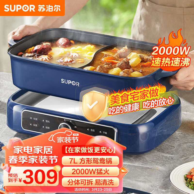 苏泊尔(SUPOR)电火锅 多功能电煮锅 火锅专用锅 分体式家用涮肉鸳鸯电热锅 7L多用途锅H3925FK872Y价格:289.00元!