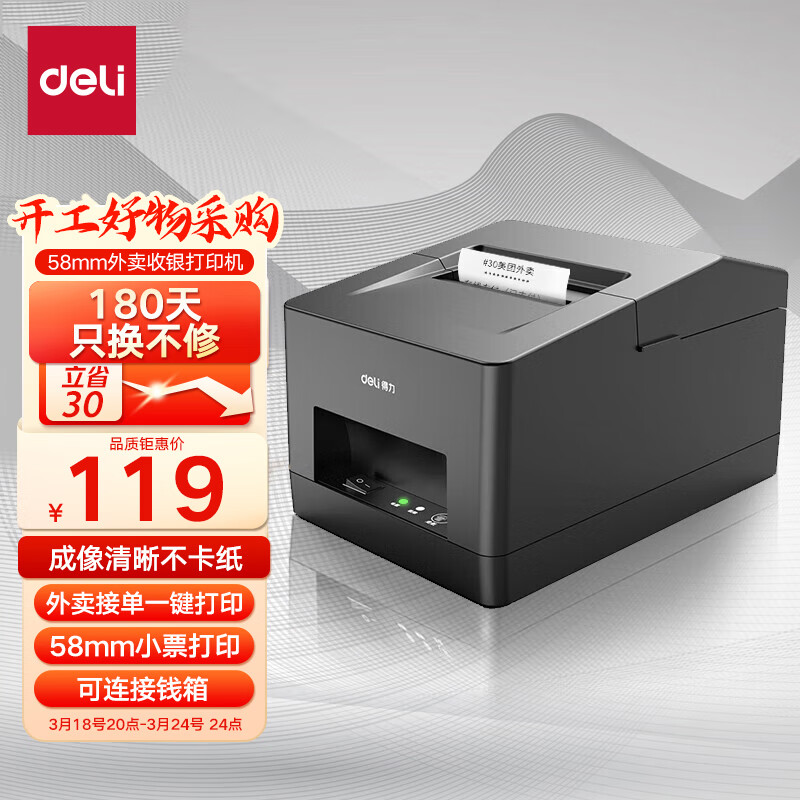 得力(deli)58MM热敏小票打印机 餐饮超市零售美团饿了么外卖单收银小票打印机DL-5801P价格:129.00元!