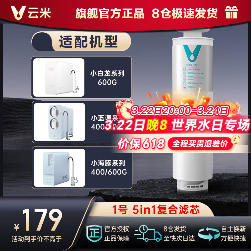 云米(VIOMI)净水器滤芯适配小蓝调 小海豚 小白龙400G、600G 1号5in1适用于Cross 600G/Cross 800G滤芯 1号5in1滤芯(只支持小蓝调/小白龙/小海豚)价格:168.00元!