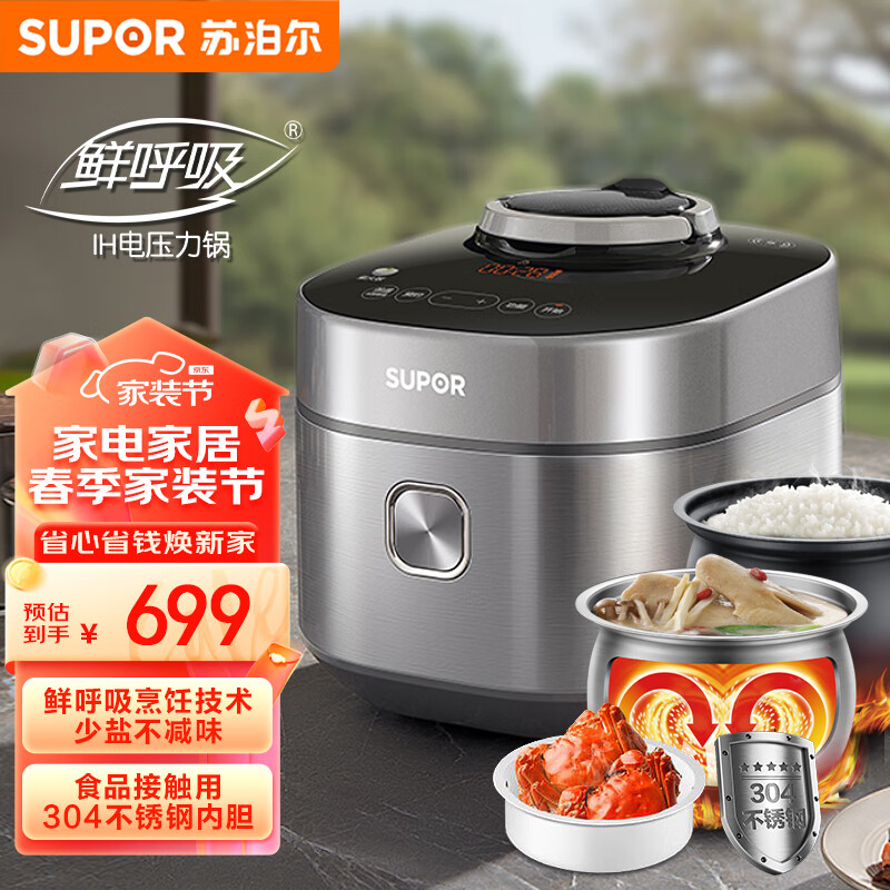 苏泊尔鲜呼吸系列电锅3L IH猛火 精钢球釜 家用双胆 网红菜谱顶置彩屏触控电饭煲高压锅SY-30FH8018Q价格:799.00元!