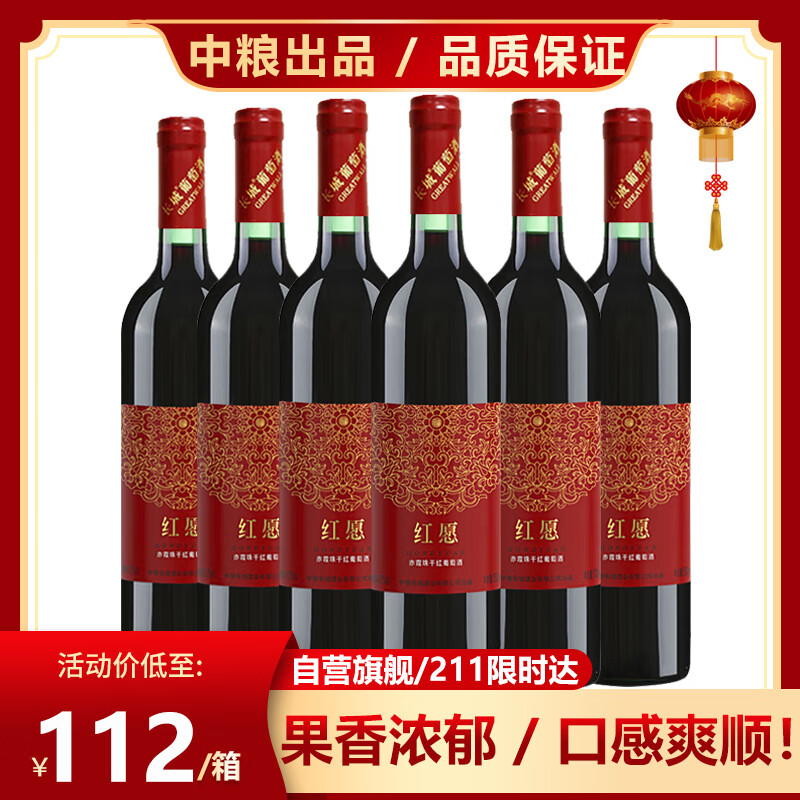 长城(GreatWall)红酒 中粮出品 赤霞珠干红葡萄酒750ML*6瓶整箱装(原箱包装)价格:112.00元!