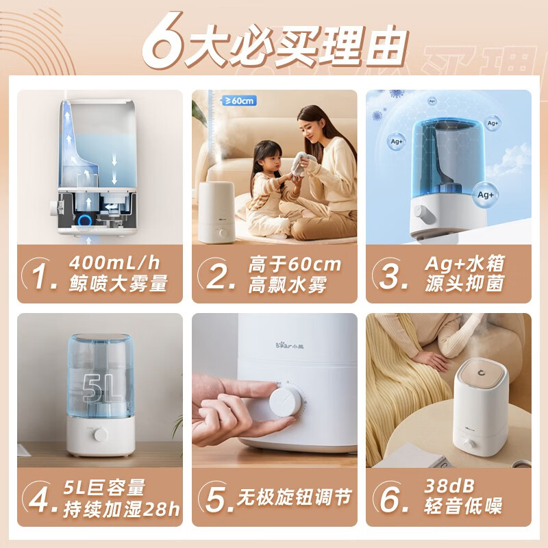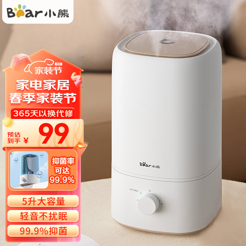 小熊(Bear) 加湿器 卧室办公室婴儿桌面空气加湿家用大雾量银离子水箱上加水5升大容量 皎月白-无滤芯价格:109.00元!