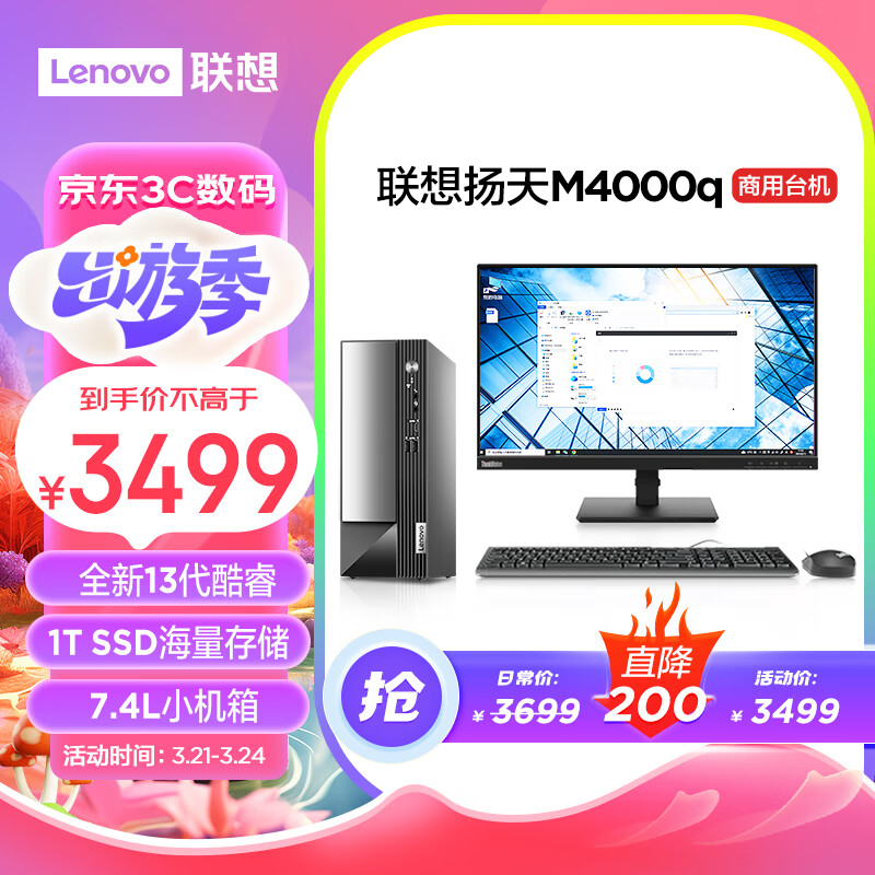 联想(Lenovo)扬天M4000q 商用办公台式电脑主机(酷睿13代i3-13100 16G 1TB SSD)23英寸价格:3499.00元!