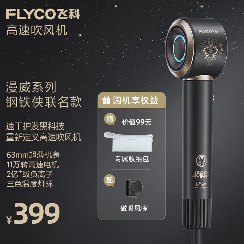 飞科(FLYCO)高速电吹风机家用宿舍用负离子护发便携大功率速干送女友节日礼物钢铁侠联名高速吹风筒FH6372价格:439.00元!
