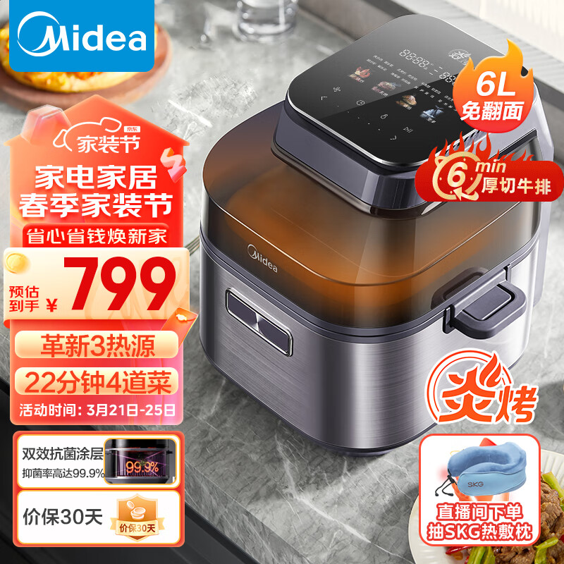 美的(Midea)炎烤Ultra 空气炸锅 3热源免翻面 可视 家用大容量 6L 多功能 不沾易洗 蒸汽嫩炸 KZS6091XM价格:749.00元!