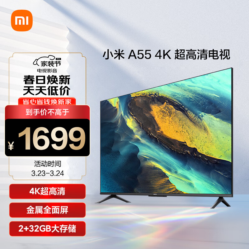 小米电视A55 2+32GB金属屏 双频WiFi 55英寸4K超高清液晶智能平板电视机L55MA-A价格:1632.00元!