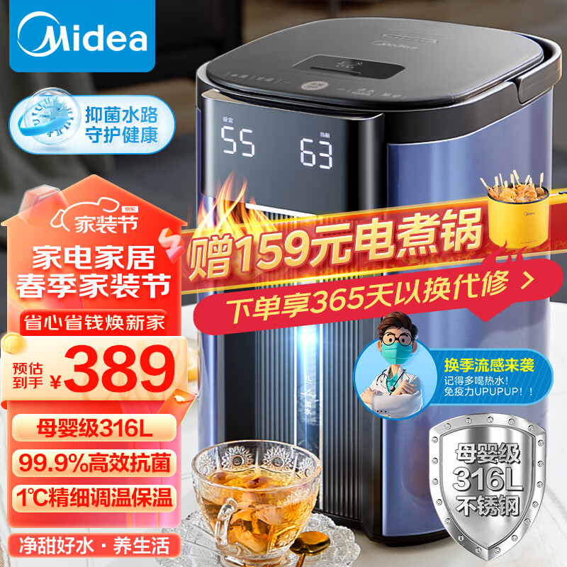 美的(Midea)电热水瓶电热水壶316L不锈钢热水瓶5L家用办公多段智能控温恒温水壶净甜开水壶烧水壶SP1A价格:389.00元!