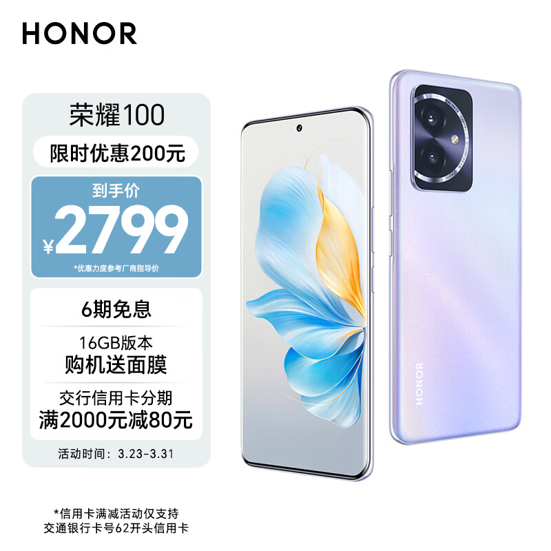 荣耀100 单反级写真相机 荣耀绿洲护眼屏 第三代骁龙7移动平台 16GB+512GB 莫奈紫 5G价格:2999.00元!