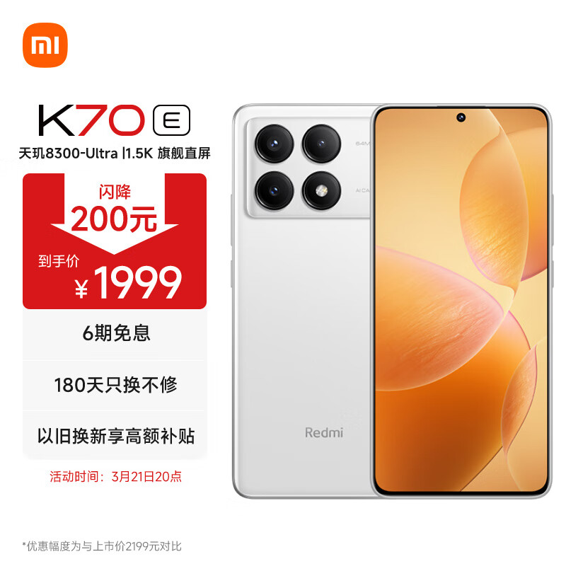 小米(MI)Redmi K70E 天玑 8300-Ultra 小米澎湃OS 1.5K 旗舰直屏 12GB+512GB 晴雪 小米红米K70E价格:1999.00元!