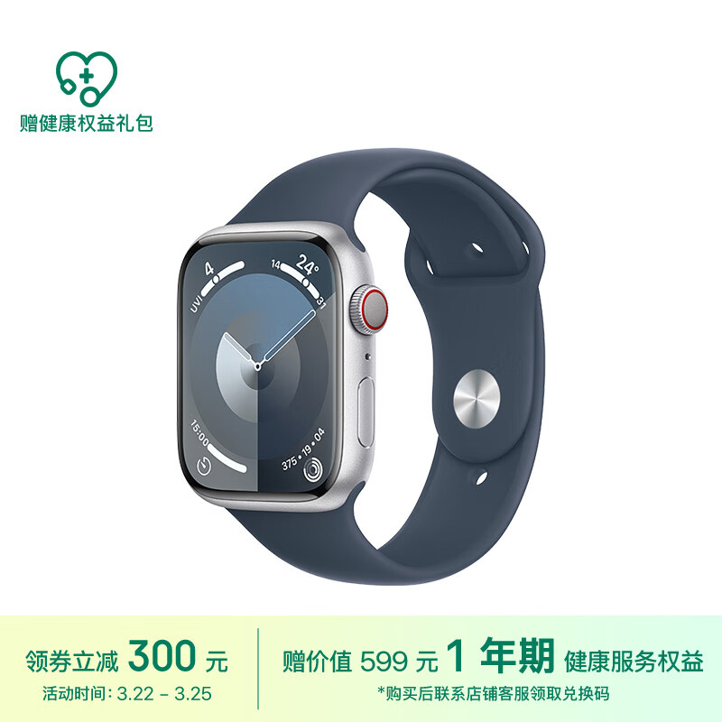 Apple/苹果 Watch Series 9 智能手表GPS+蜂窝款45毫米银色铝金属表壳风暴蓝色运动型表带M/L MRP93CH/A价格:3999.00元!