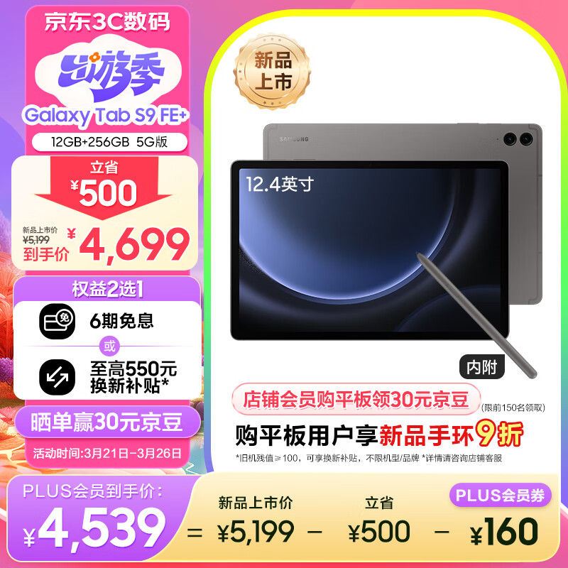 三星(SAMSUNG) S9 FE+ 2023款Tab平板电脑12.4英寸12+256GB 5G版护眼高清大屏IP68防水含Spen 石墨灰价格:4699.00元!