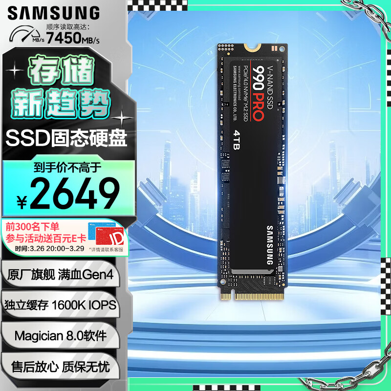 三星(SAMSUNG)4TB SSD固态硬盘 M.2接口(NVMe协议PCIe 4.0 x4) 990 PRO (MZ-V9P4T0BW)价格:2649.00元!