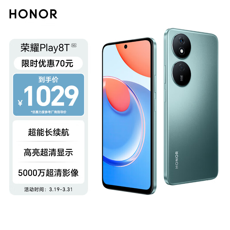 荣耀Play8T 6000mAh超能长续航 850nit高亮超清显示 5000万像素超清影像 8GB+256GB 墨玉青 5G价格:1029.00元!