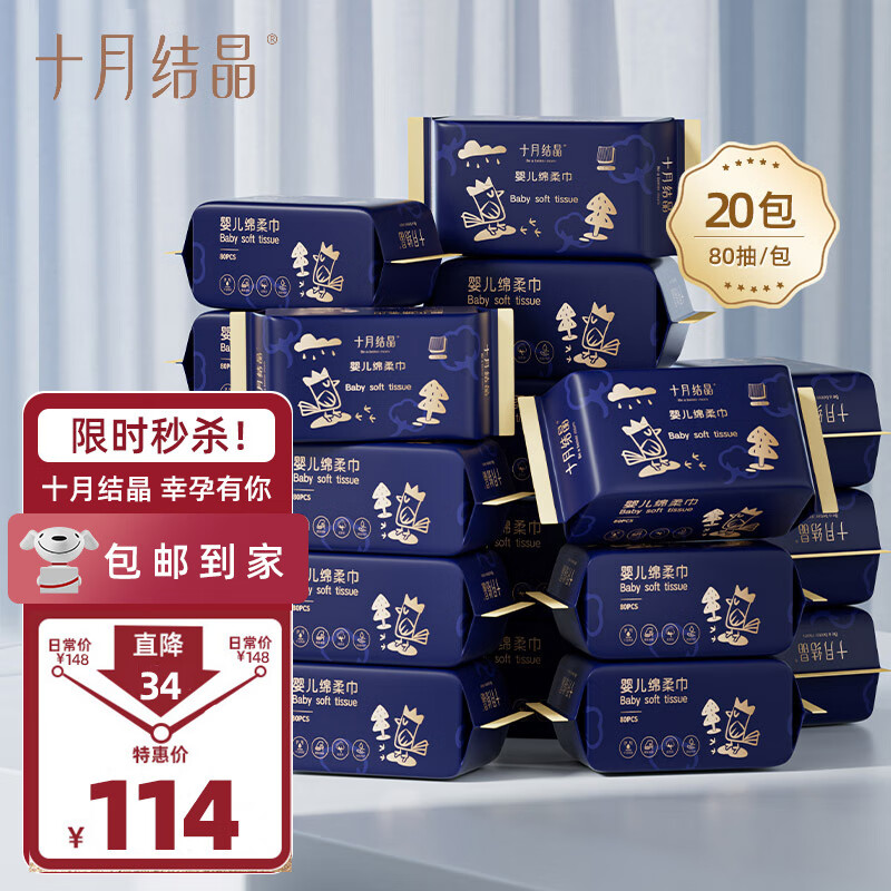 十月结晶婴儿绵柔巾80抽*20包干湿两用一次性洗脸巾加厚亲肤洁面巾17*20CM价格:114.00元!