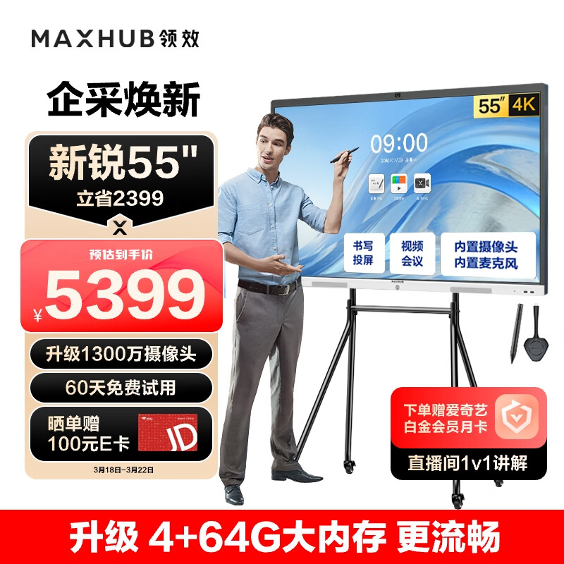 maxhub会议平板V6新锐55英寸 触摸视频会议电视一体机 投屏电视智慧屏 E55+支架+传屏+笔 企采商用显示价格:5399.00元!
