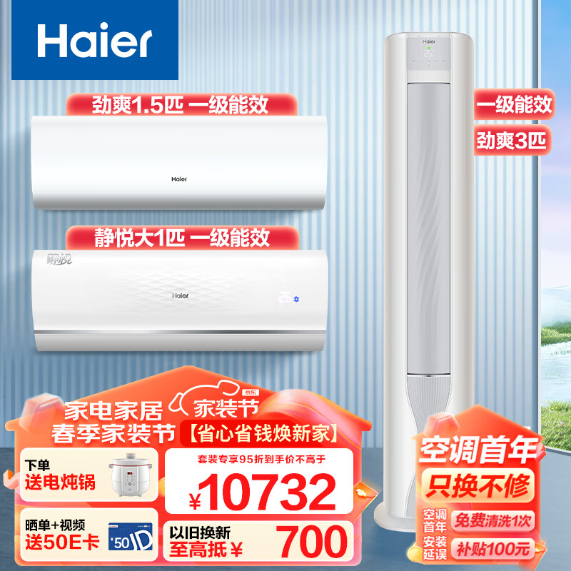 海尔(Haier) 新一级变频 冷媒变流 两室一厅空调套装 (劲爽1.5匹挂机+大1匹静悦挂机+3匹荣耀柜机) 以旧换新价格:10732.00元!