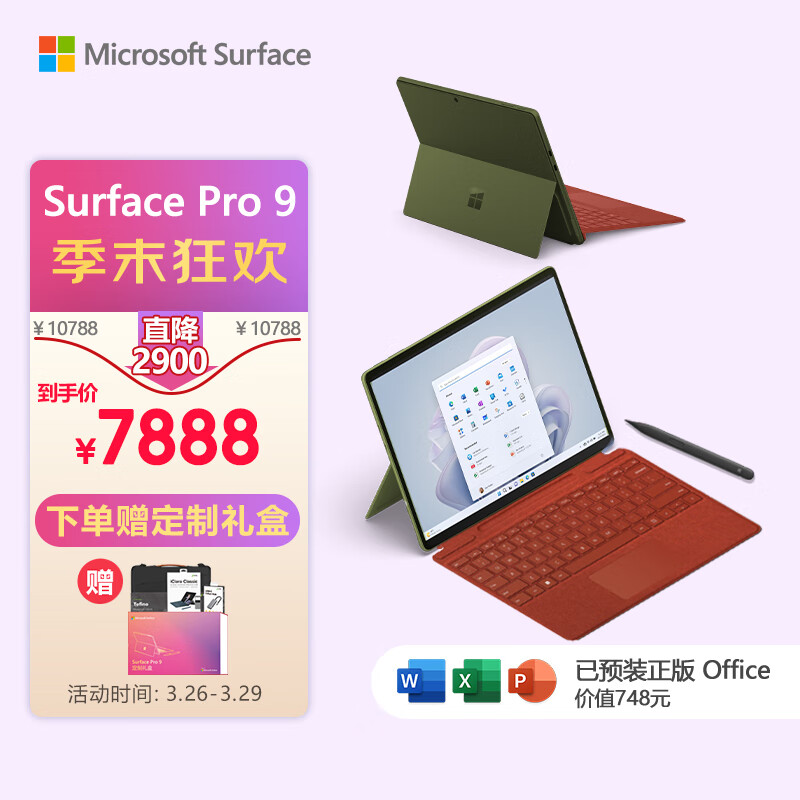 微软Surface Pro 9森野绿+波比红带触控笔键盘盖i5 8G+256G 二合一学生平板 13英寸120Hz屏 笔记本电脑价格:7888.00元!