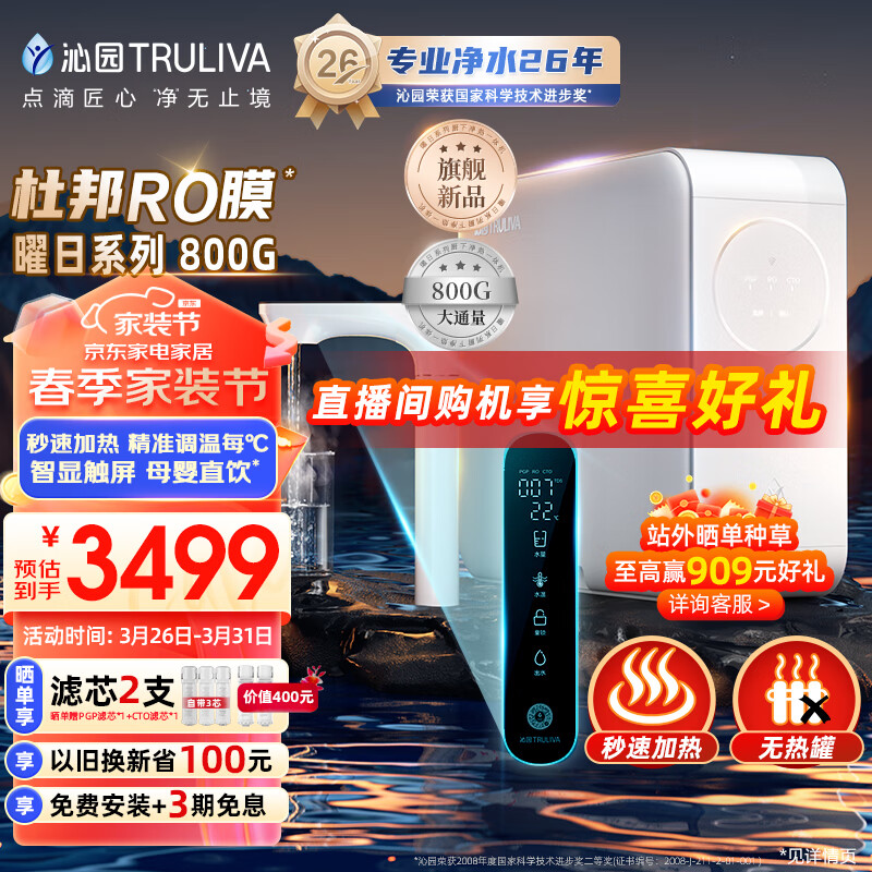 沁园(TRULIVA)曜日加热净水器800G 5年RO反渗透 智能触控屏精准调温 家用厨下即热直饮一体机 UR-S5846H价格:3499.00元!