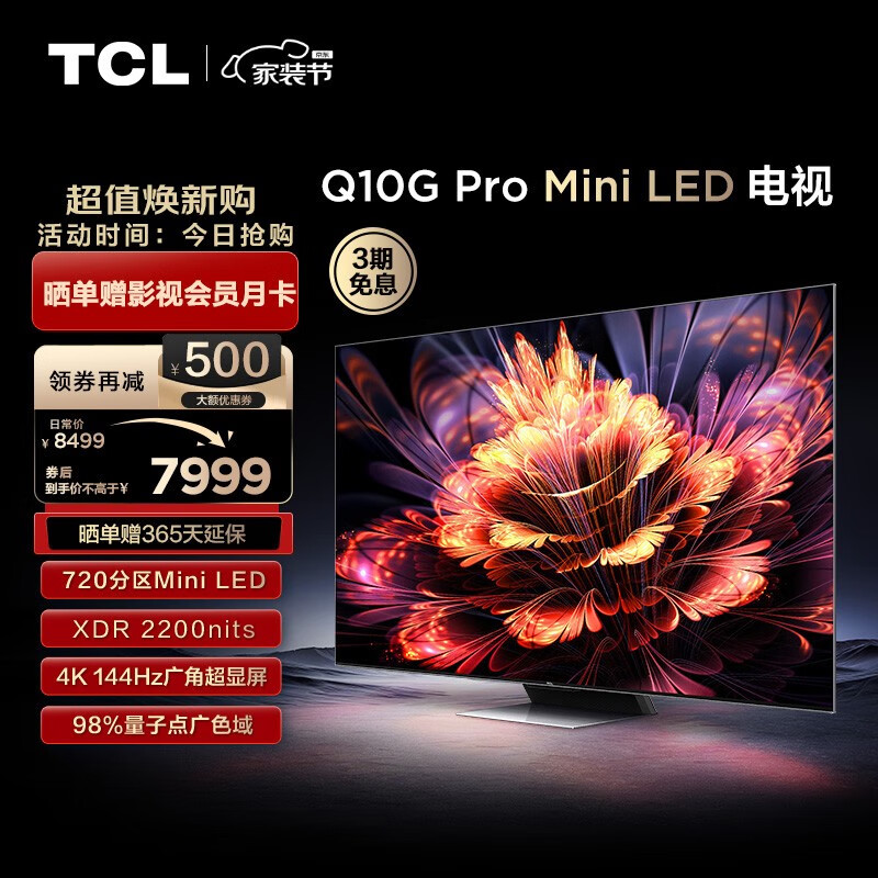 TCL电视 75Q10G Pro 75英寸 Mini LED 720分区 2200nits 4K 144Hz 2.1声道音响 液晶智能平板电视机价格:8499.00元!