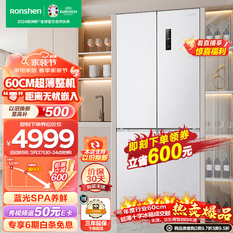 容声(Ronshen)60厘米薄503升十字对开四开门超薄嵌入式冰箱家用变频一级能效大容量底部散热BCD-503WD1FPQ白色价格:5599.00元!