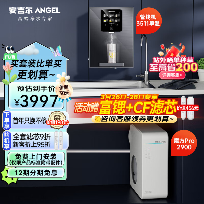 安吉尔净水器家用过滤器套装【魔方pro2900+管线机3511】5年RO反渗透厨下式直饮机1100G体验价格:3997.00元!