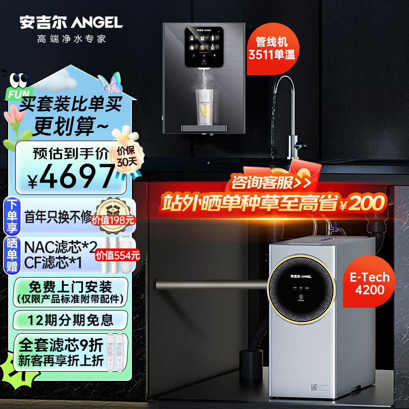 安吉尔净水器家用过滤器套装【E-tech4200+管线机3511】5年RO反渗透厨下式直饮机1600G流速体验价格:4697.00元!