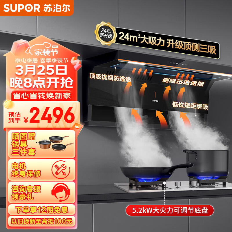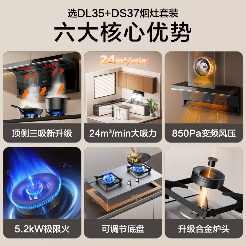 苏泊尔(SUPOR)抽油烟机 双腔拢烟顶侧双吸油烟机灶具套装 24立方大吸力变频烟灶 家用油烟机燃气灶 DL35+DS37液价格:2496.00元!