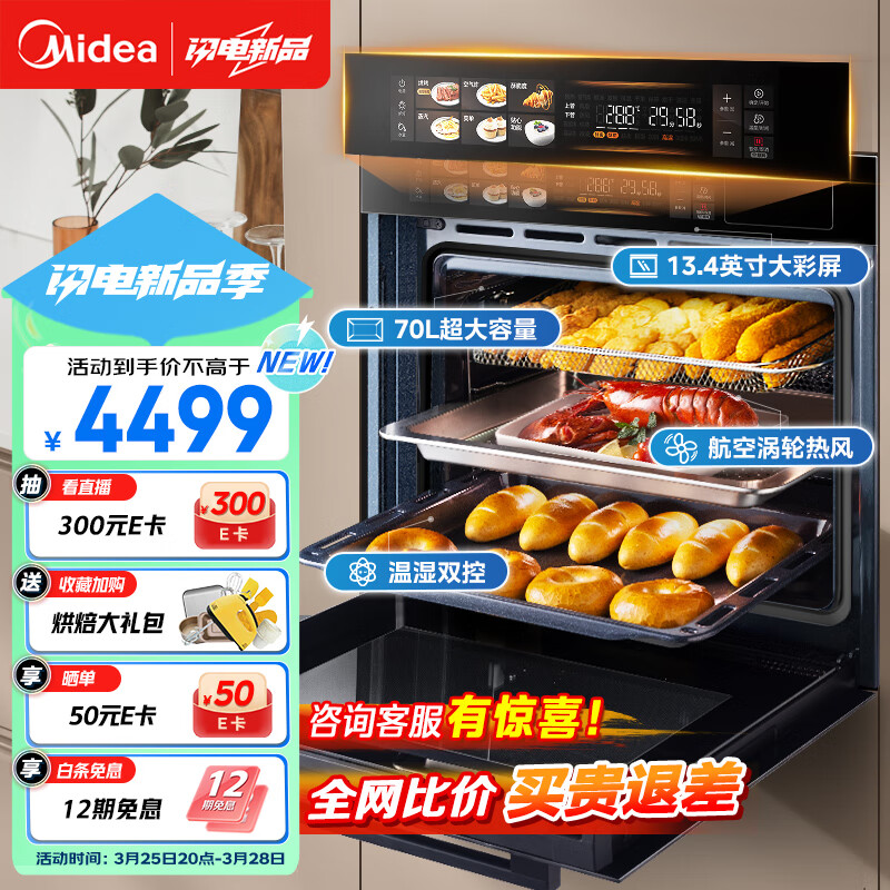 美的70L大容量嵌入式蒸烤箱一体机 航空涡轮热风 温湿双控 13.4英寸大彩屏 蒸烤炸炖4合1体SX7价格:4499.00元!