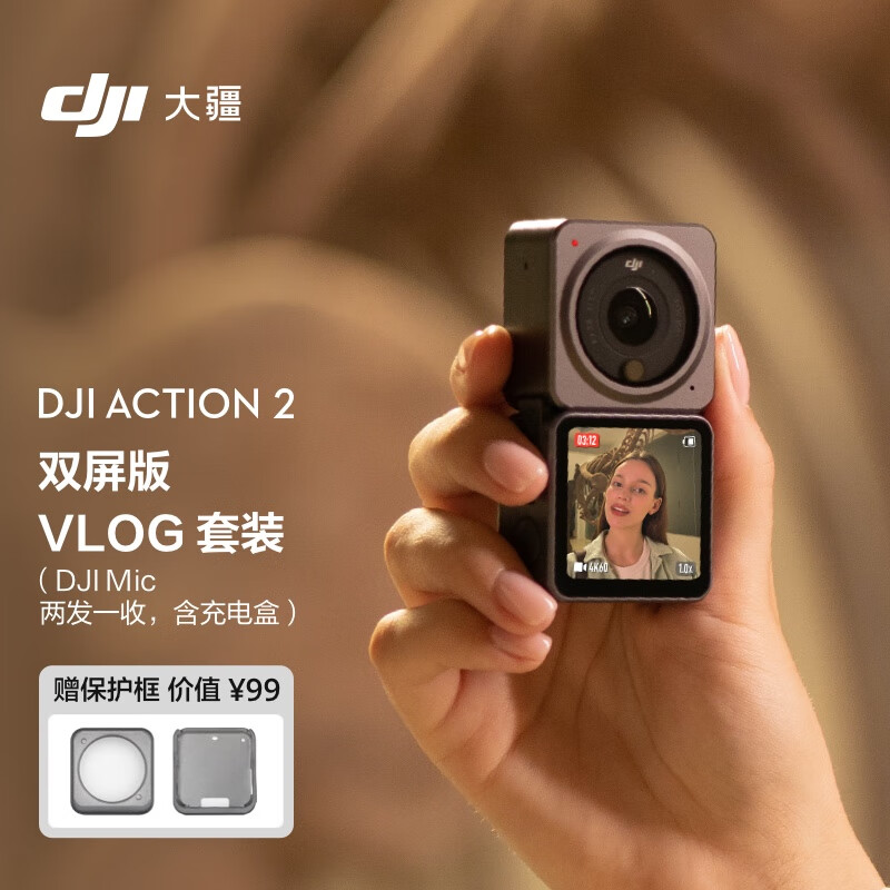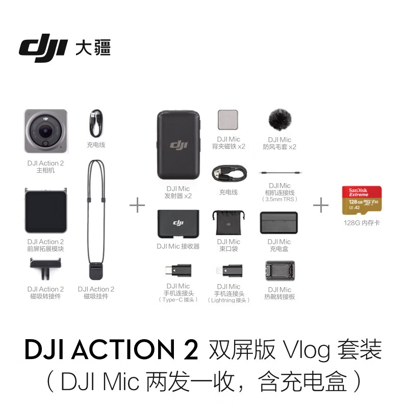 大疆 DJI Action 2 双屏版 Vlog 套装(DJI Mic 一拖二)灵眸防抖运动相机 vlog摄像机+随心换2年版实体卡价格:4856.90元!