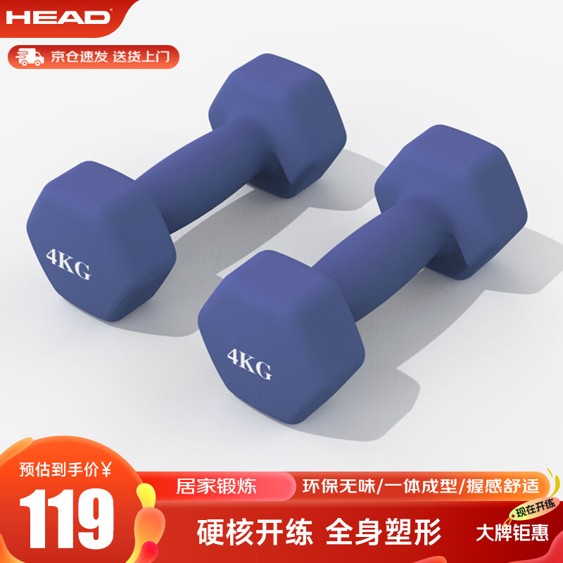 HEAD海德彩色浸塑哑铃男士女士肌肉塑形家用健身蓝色 4kg*2价格:119.00元!